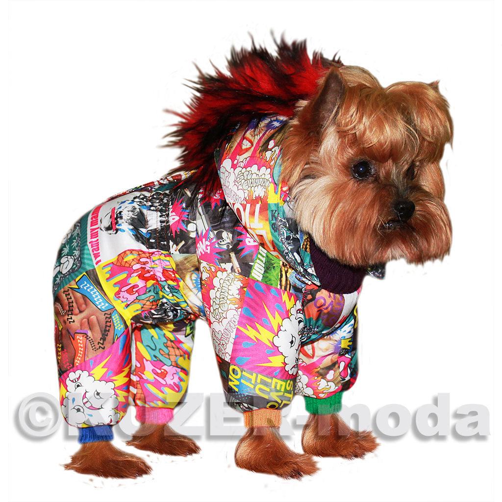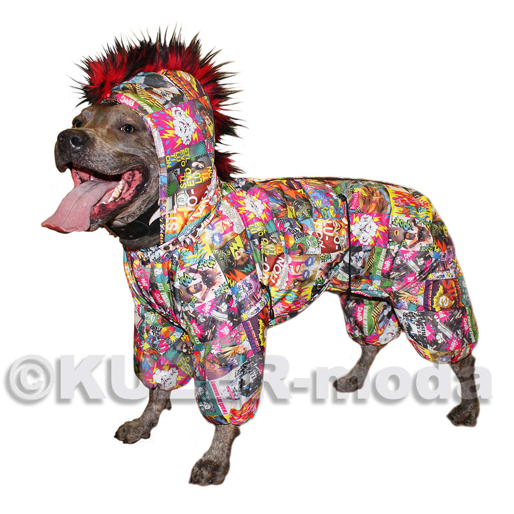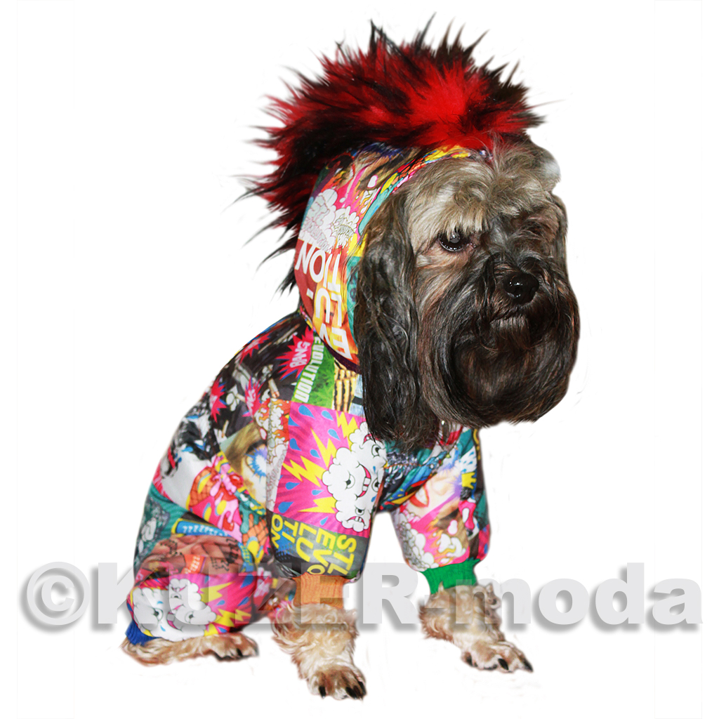 комбинезон для ценителей «неформального» стиля. Только утеплённый вариант - на халлофайбере, застёжка на кнопки, капюшон с цветной меховой отделкой , имитирующей «панковский» гребень. Яркая плащевая ткань «под комиксы», трикотажныя горловина и манжеты разных цветов. Бережная машинная стирка.